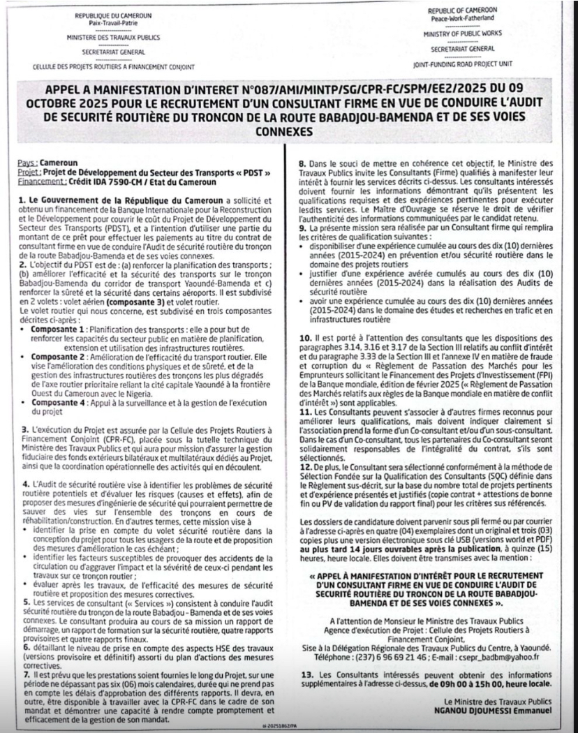 Dans le souci de renforcer la sécurité et la performance du réseau routier national, le Ministère des Travaux Publics lance un appel à manifestation d’intérêt pour le recrutement d’un consultant chargé de conduire l’audit sécuritaire de la route Babadjou–Bamenda et de ses voies connexes.