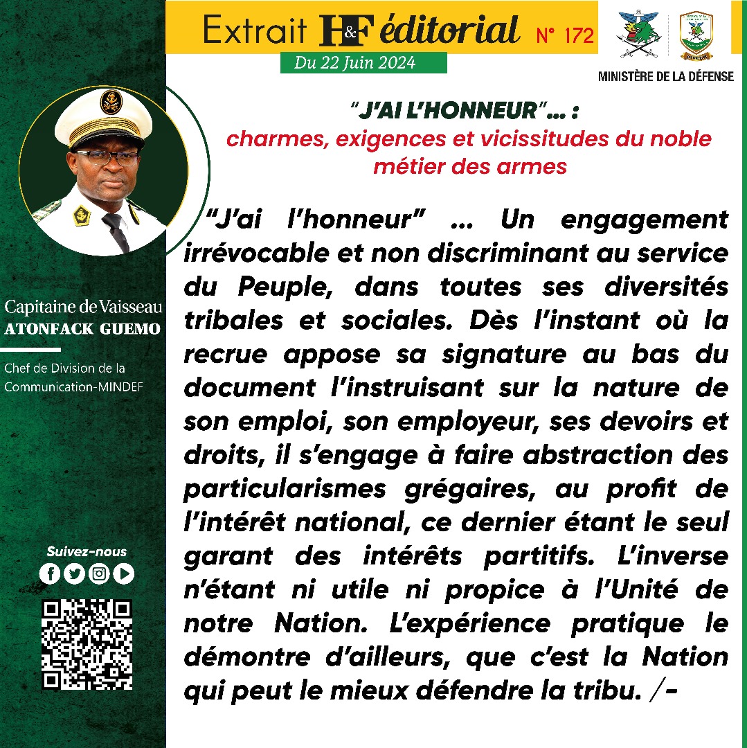 J’ai l’honneur… Un engagement irrévocable et non discriminant au service du Peuple, dans toutes ses diversités tribales et sociales. Dès l’instant où la recrue appose sa signature au bas du document l’instruisant sur la nature de son emploi, son employeur, ses devoirs et droits, il s’engage à faire abstraction des particularismes grégaires, au profit de l’intérêt national, ce dernier étant le seul garant des intérêts partitifs. L’inverse n’étant ni utile ni propice à l’Unité de notre Nation. L’expérience pratique le démontre d’ailleurs, que c’est la Nation qui peut le mieux défendre la tribu.