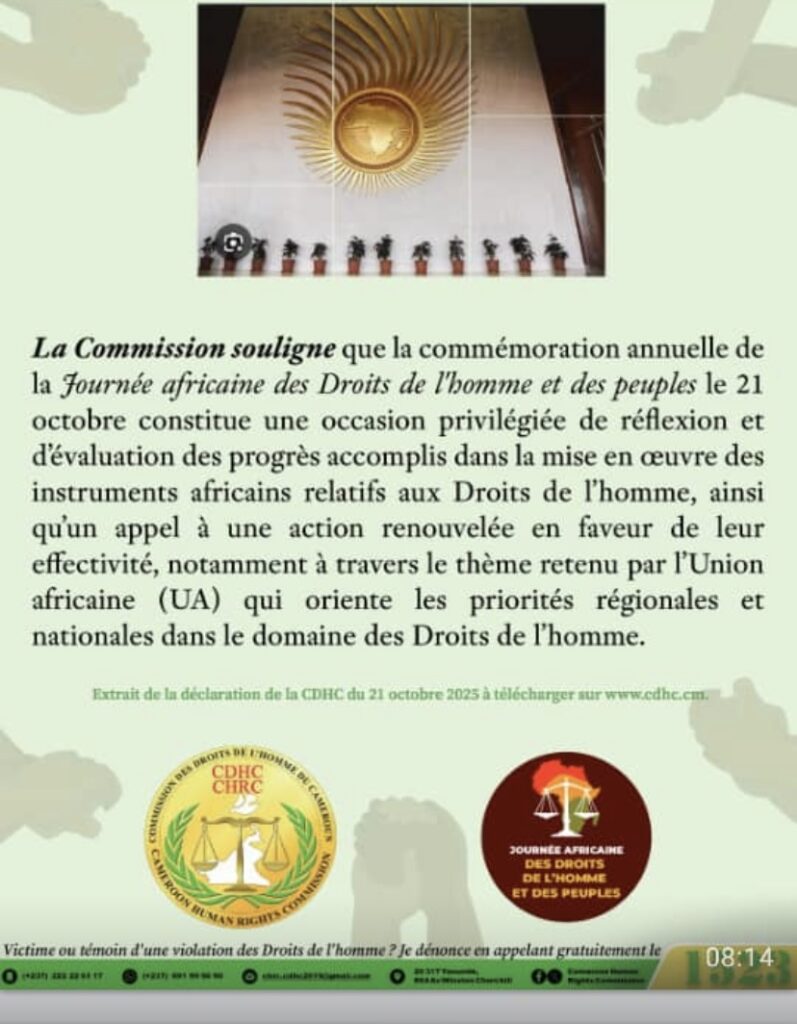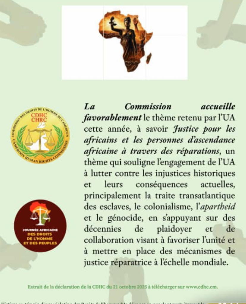 A l’occasion de la journée africaine des droits de l’homme et des peuples, célébrée le 21 Octobre , l’organe dirigé par le Pr. James Mouangue Kobila a réaffirmé son engagement indéfectible envers la promotion et la protection des droits fondamentaux sur le continent. Une commémoration ancrée dans le calendrier de l’Union Africaine, qui s’affirme comme une plateforme essentielle pour évaluer les progrès réalisés et renouveler les efforts en faveur de la pleine effectivité des instruments régionaux relatifs aux droits humains et aux droits des peuples. Le thème de cette année, « Justice pour les Africains et les personnes d’ascendance africaine à travers des réparations », résonne particulièrement, soulignant la nécessité impérieuse de s’attaquer aux injustices historiques et à leurs manifestations persistantes.