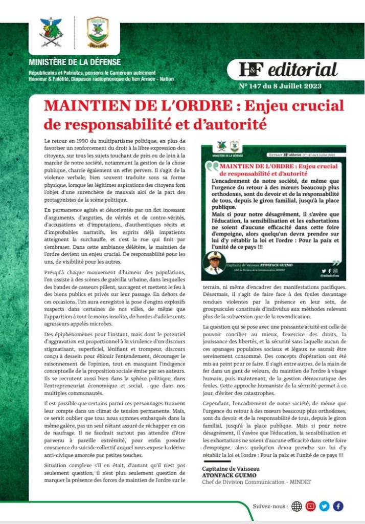 Dans un éditorial rendu publique le 08 juillet 2023, le Chef de la Division communication du ministère de la défense presente les phénomènes opportunistes qui troublent la paix et la tranquillité du pays. Tout en identifiant nommément ces maux, le Capitaine de vaisseau invite l’ensemble de ses compatriotes à participer activement à la lutte contre ce desordre.