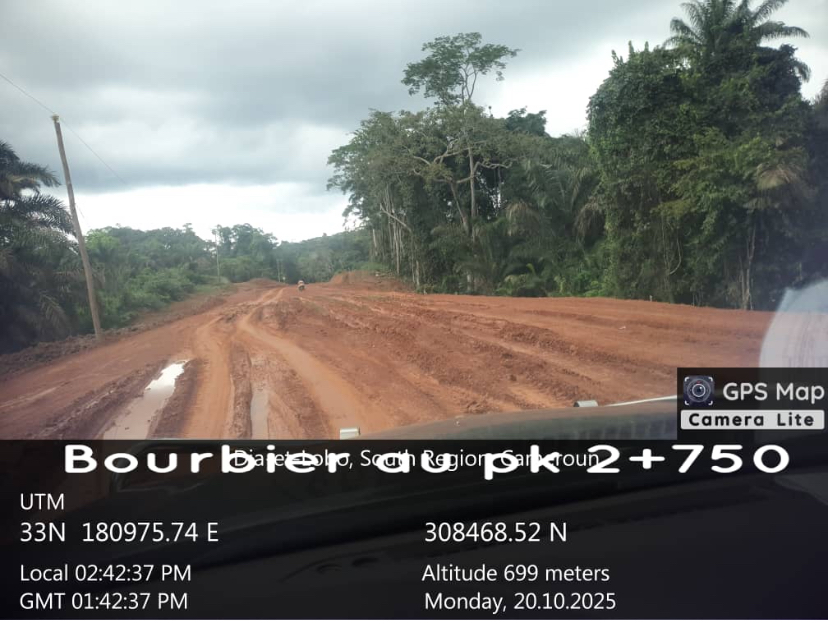 Depuis le début du mois d’octobre 2025, avec les pluies, l’entreprise SEAS–COSEDIL traite des bourbiers entre les points kilométriques 1+960 et 2+750 de la route Olounou–Oveng. Ces travaux visent à renforcer la portance du sol et à assurer la continuité des travaux de terrassement.