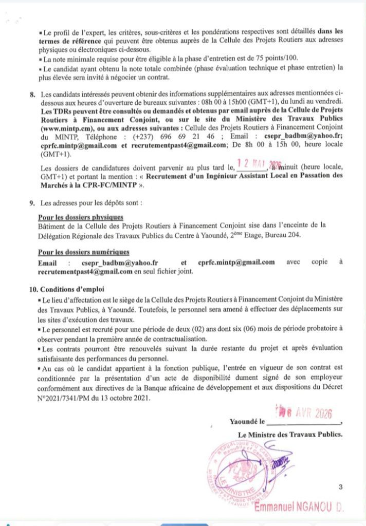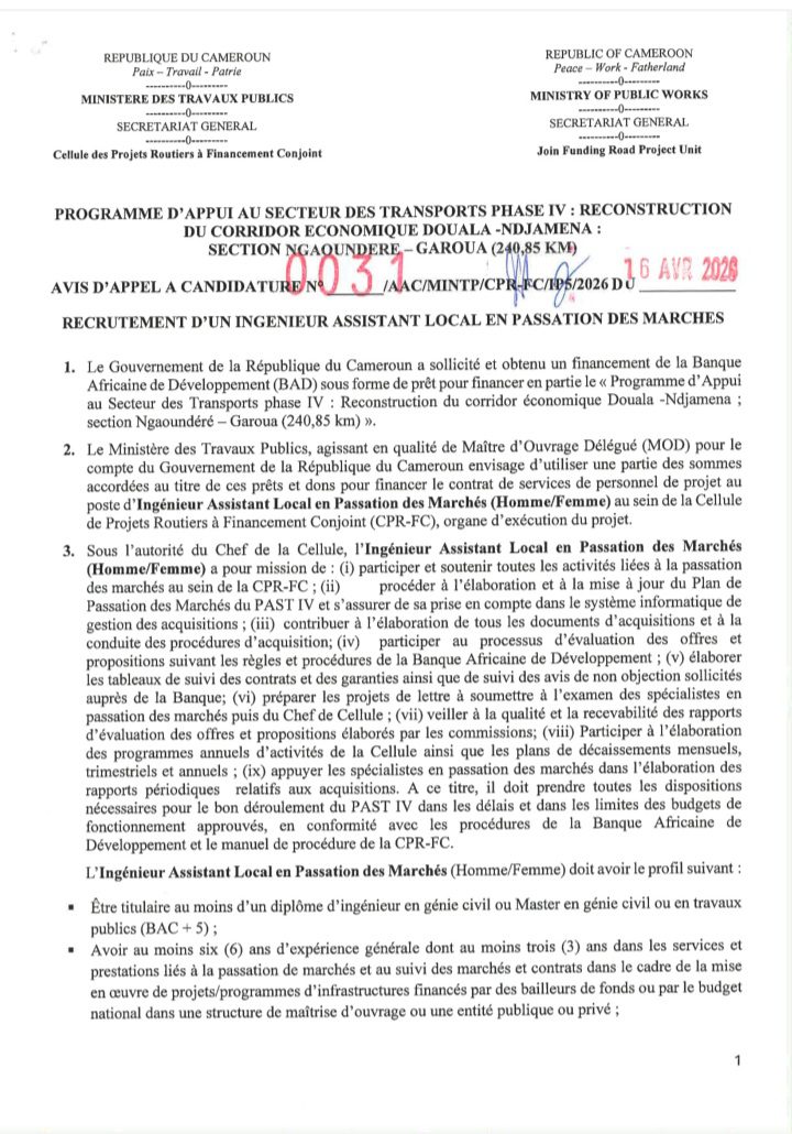 Pour assurer la bonne mise en œuvre du Programme d’Appui au Secteur des Transports, phase IV (PAST IV), le Ministère des Travaux Publics lance un avis d’appel à candidature pour le recrutement d’un Ingénieur Assistant Local en passation des marchés. Cette initiative s’inscrit dans le processus de reconstruction de la section Ngaoundéré–Garoua (240,85 km), composante majeure du corridor économique Douala–N’Djamena.