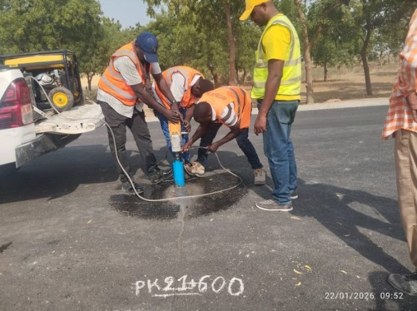Au 2 février 2026, le projet connait un avancement de 82,40% et dans l’attente du geogrille destiné à renforcer la chaussée, quelques prestations sont en cours. Sur le chantier, la mise en œuvre des accotements en grave non traité 0/31.5 et les travaux d’assainissement se poursuivent. La mise en œuvre des enduits superficiels bicouche a démarré il y a une semaine. L’entreprise finalise la commande et l’acheminement du geogrille sur le site. Cette mesure qui ralentit certes les travaux, est bénéfique pour la durabilité de la chaussée en reconstruction. Les équipes ont revu leur planning pour s’adapter à cette nouvelle donne du projet. Du reste, les prestations relatives aux terrassements, à la couche de fondation au sol amélioré au ciment, à la couche de fondation en grave concassé 0/20 anti fissuration, à l’imprégnation sablée, à la couche de base en grave bitume et à la couche d’accrochage sont achevées.